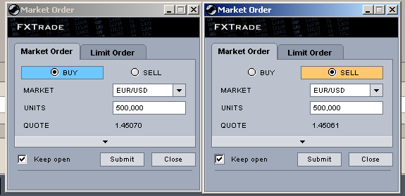 Im Order-Fenster wurde das leider nach User-Protesten im Forum wieder abgeschafft. Schade, das war bei weitem die bessere Lösung. Jetzt hat man halt wieder ein sinnlosen Click mehr (Buy und Sell Radio-Boxen + Submit anstatt dem 1-Click Interface). Der Sinn erschliesst sich mir nicht so richtig, einige Oanda-Forum-Oldtimer verkraften das anscheinend psychisch nicht wenn ihr Fenster aufeinmal anders aussieht.