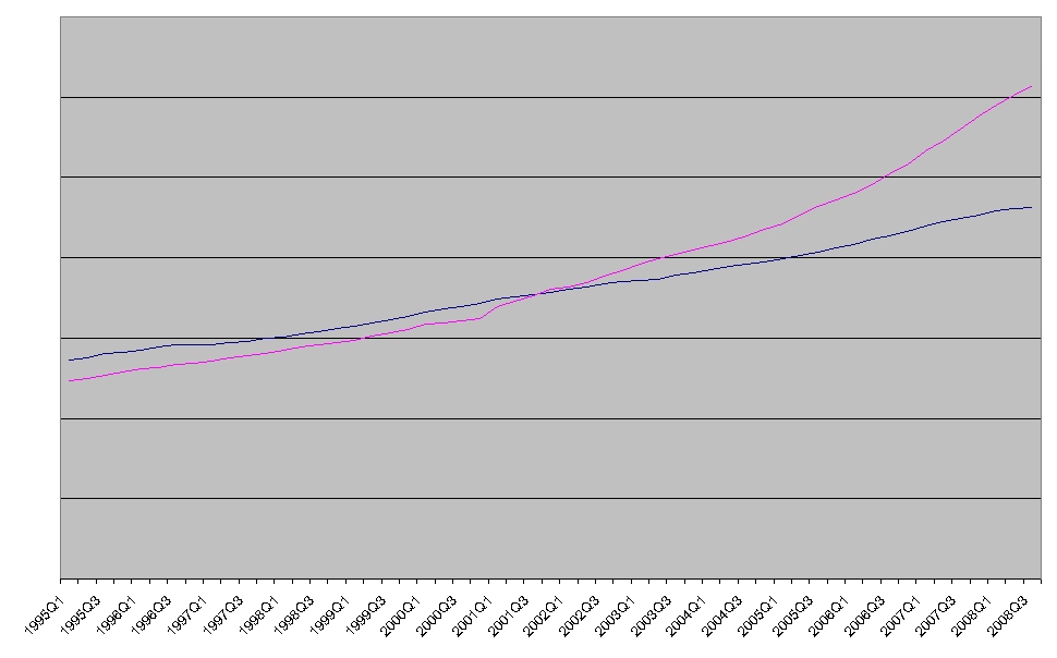 Wächst die Geldmenge schneller als die Wirtschaft entsteht Inflation, wächst die Wirtschaft schnell als die Geldmenge entsteht Deflation. Tatsächlich hat ist die Geldmenge seit Q4 2000 schneller gewachsen als die Wirtschaft, was tendentiell für steigende Inflation steht, wie wir sie in den letzten Jahren auch erlebt haben!