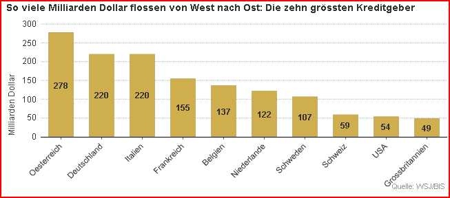 Der drohende Crash in Osteuropa könnte auch die Banken im Westen in den Abgrund reissen. Am heftigsten betroffen sind österreichische Finanzinstitute. Sie haben im Osten laut «Wallstreet Journal» Kredite in der Höhe von 278 Milliarden Dollar ausgestellt - das entspricht fast zwei Dritteln des Bruttoinlandprodukts Österreichs. Fast die Hälfte des Auslandsgeschäfts der österreichischen Bank entfällt auf Osteuropa. Entsprechend stürzten die Kurse ab: Die Erste Bank verlor über 18 Prozent, die österreichische Raiffeisen 13,5 Prozent.