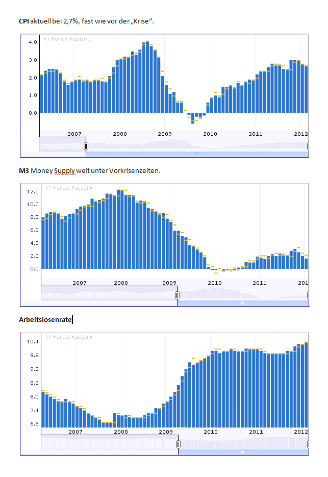 M3 ist weit unter Vorkrisenzeit, ich dachte eigentlich das sollte anders sein. CPI ist jedoch über den Vorkrisenständen, denke mal das ist hauptsächlich Energiepreisverursacht. Dazu noch eine ansteigende Arbeitslosigkeit. PMI ist auch nicht gerade am steigen, bzw. war schon sehr hoch, jetzt fallend(Alle Charts beziehen sich auf den EU-Raum).