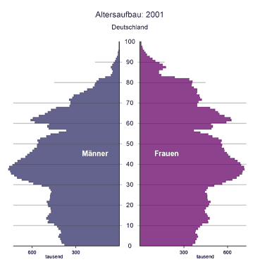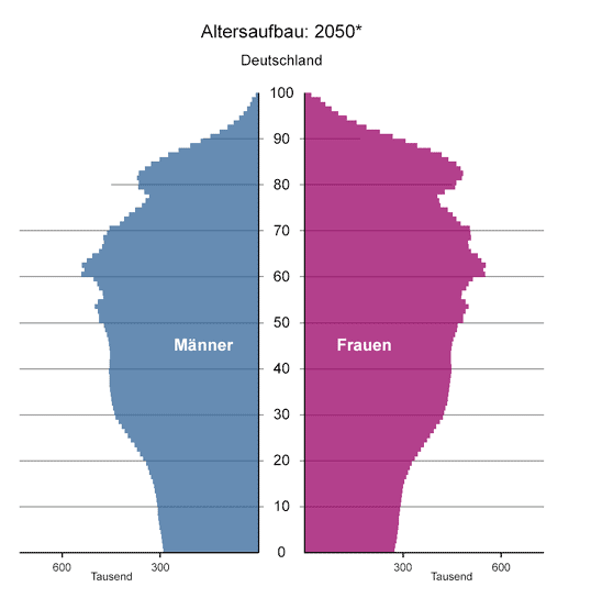 Wenn man den demografischen Wandel, wie unten in der Grafik, betrachtet, dann fällt auf, dass die heute 1 – 20 Jährigen weitaus geringer vertreten sind. Dann muss man sich fragen, wo denn die Renten in 20 – 30 Jahren herkommen könnten? Wer wird den Staat finanzieren?