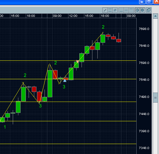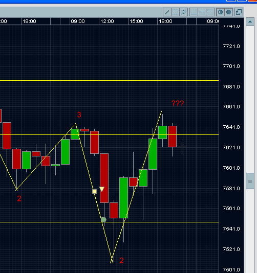 Einstieg: 12.15 Uhr bei 7577 SHORT per Limitorder am Punkt 2