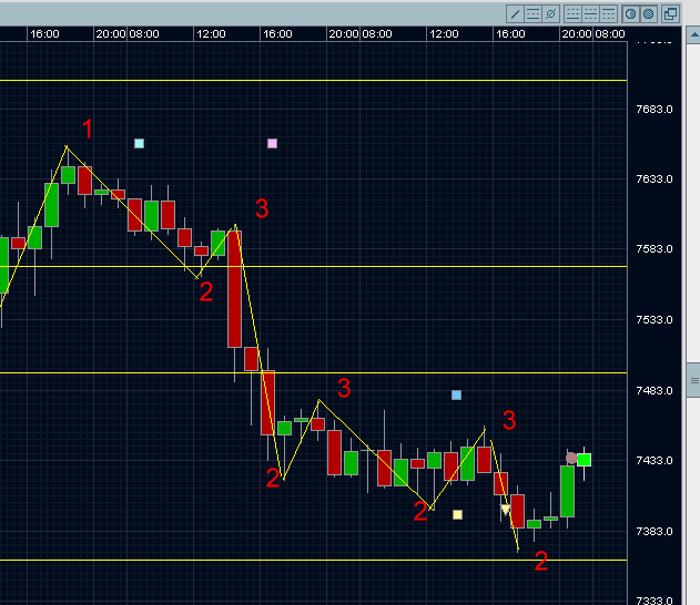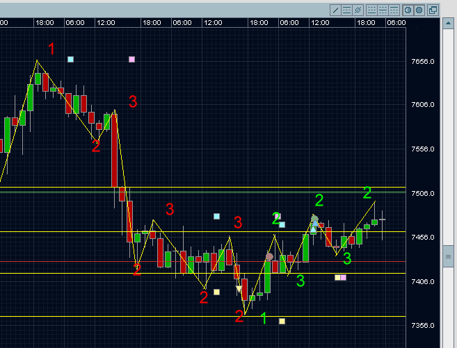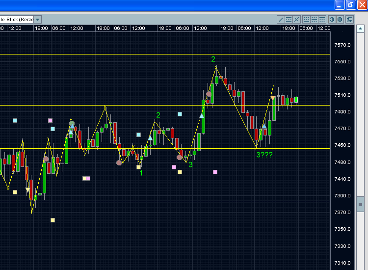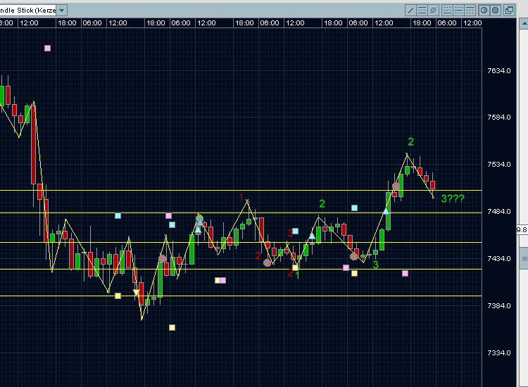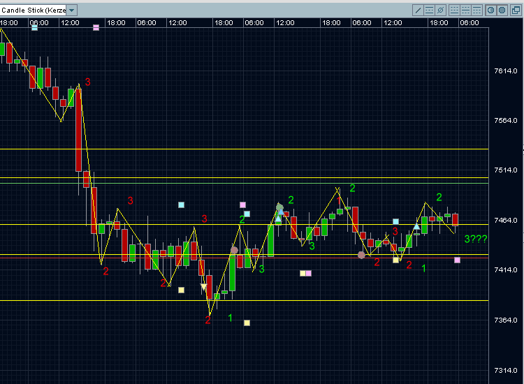 Einstieg: gestern 16.31 Uhr bei 7461 LONG per Limitorder oberhalb der Pivot nach Durchbruch der alten (roten) 3