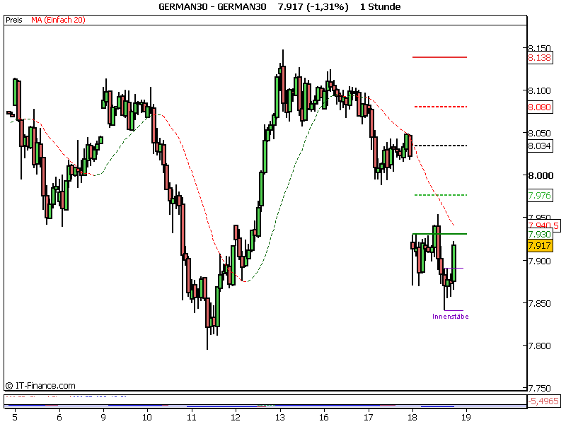 Bei konsequenter Anwendung der Trailingstoppregel hätte ich die Shortposition ja über Nacht halten müssen. Das Riesengap heute Morgen hätte den Gewinn noch um ein Vielfaches vergrößert. Nach weiteren Innenstäben hätte ich die Position etwa bei 7945 Punkten gegen 16.00 Uhr schließen müssen, weil eine grüne Kerze oberhalb des Außenstabs geschlossen hat.