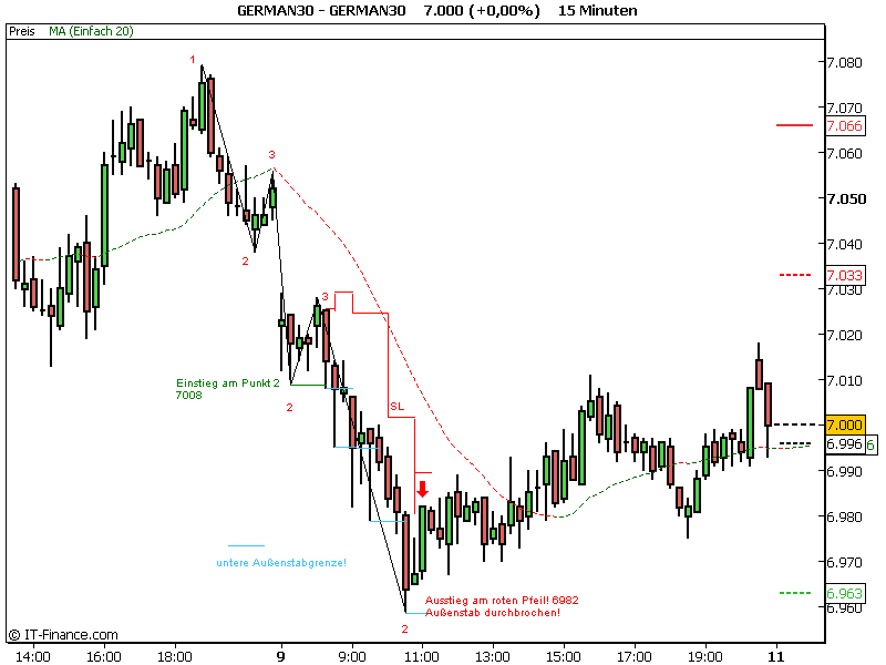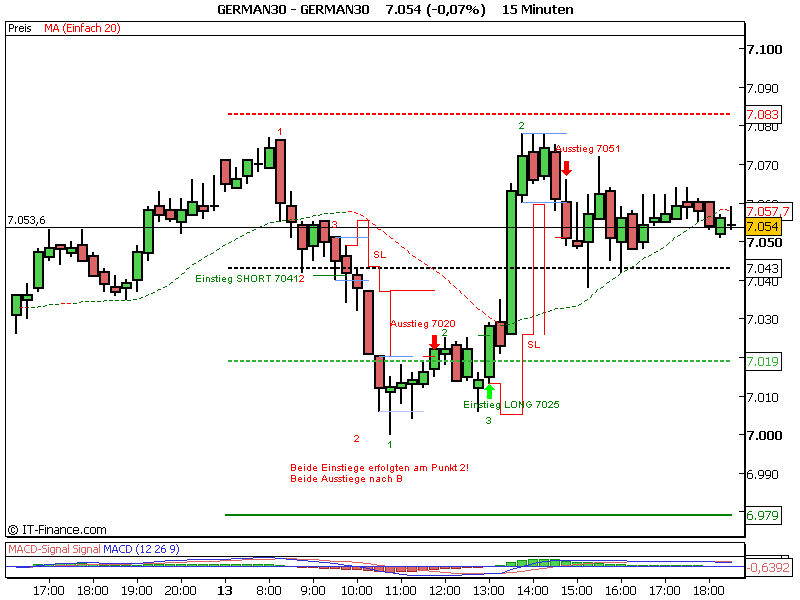 Auf die Auswahl meiner Trades lege ich wesentlich mehr Wert, das heißt nicht jedes Signal wird gehandelt. Ich versuche qualitativ hochwertige Trades zu finden. Deshalb widme ich viel Zeit dem Studium von Fachliteratur und vor allem der Analyse von Charts. Natürlich habe ich auch das Geschehen hier im Candletalk weiter verfolgt. Auch meine anderen Hobbys (Sport) und die Familie dürfen nicht zu kurz kommen. So habe ich für die Dokumentation der einzelnen Trades im Blog bzw. hier im Candletalk einfach keine Zeit mehr übrig. Der ursprüngliche Grund für die ausführlichen Dokumentationen - Selbstdisziplinierung - hat sich ja auch erledigt. Das heißt konkret: Der Blog bei Blog.de wird nicht weiter geführt. Was den Thread im Candletalk betrifft, darüber bin ich mir noch nicht im klaren. Möglicherweise werde ich ihn hin und wieder für Beispieltrades nutzen. Als kleinen Anfang kann ich ja mal einen Handel der Bewegung vom letzten Freitag im DAX 15 Min Zeitfenster einstellen. Allerdings gibt es nur einen Chart versehen mit Bemerkungen.