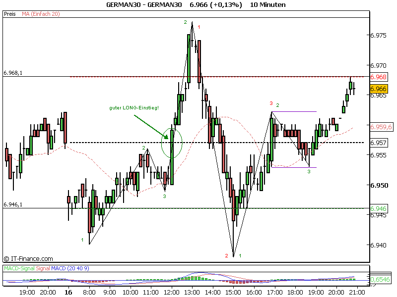 Einstieg um 17.24 Uhr (Systemzeit 16.24 Uhr) LONG bei 6987 Punkten oberhalb der roten Pivot am Ende der Korrektur per Marketorder. Den Stopp legte ich auf 6974 Punkte unterhalb des Vortageshoch genau an das letzte lokale Tief. Ziel war der Ausbruch durch Punkt 2 möglichst bis an die 6700 heran. Doch daraus wurde nichts. Der DAX schlief auf der Pivotlinie ein. Nach zwei Stunden stellte ich die Position um 19.36 Uhr (Systemzeit 18.26 Uhr) bei 6986 Punkten glatt. Meine Geduld war am Ende, mein Tradingtag auch.