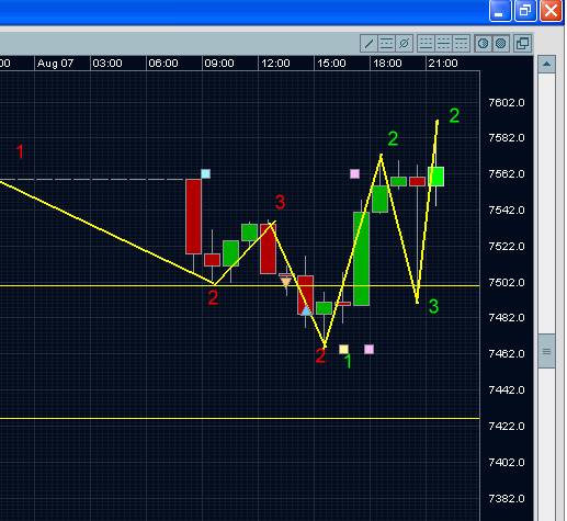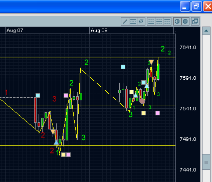 Damit hat die letzte Kerze heute den LONG-Trend (auf Stundenbasis) gebrochen und es besteht die Möglichkeit, dass sich nach erfolgter Korrektur ein neuer SHORT-Trend herausbildet. Aber auch ein weiterer Weg nach oben ist möglich. Im Moment scheinen keine lang anhaltende Trends zu entstehen und ein ständiger Wechsel zwischen LONG und SHORT ist wohl eher wahrscheinlich.