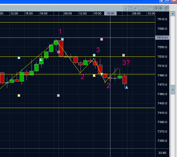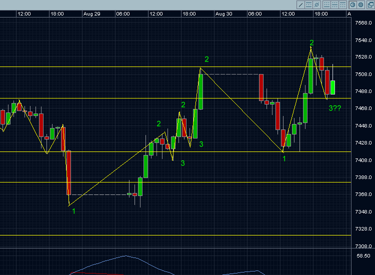 Einstieg: 20.05 Uhr (gestern) bei 7501 LONG per Marketorder in der Korrektur