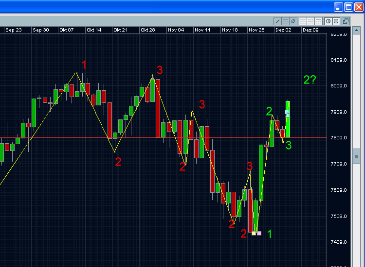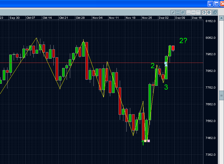Gab es heute den Startschuss zur Jahresendrallye? Der Schorttrend wurde an der roten 3 gebrochen. Möglicherweise kommt es in den nächsten Tagen zur Ausbildung eines Longtrends. Ich warte auf Bestätigung (Korrektur und Bruch der 2) und bleibe bis dahin flat.