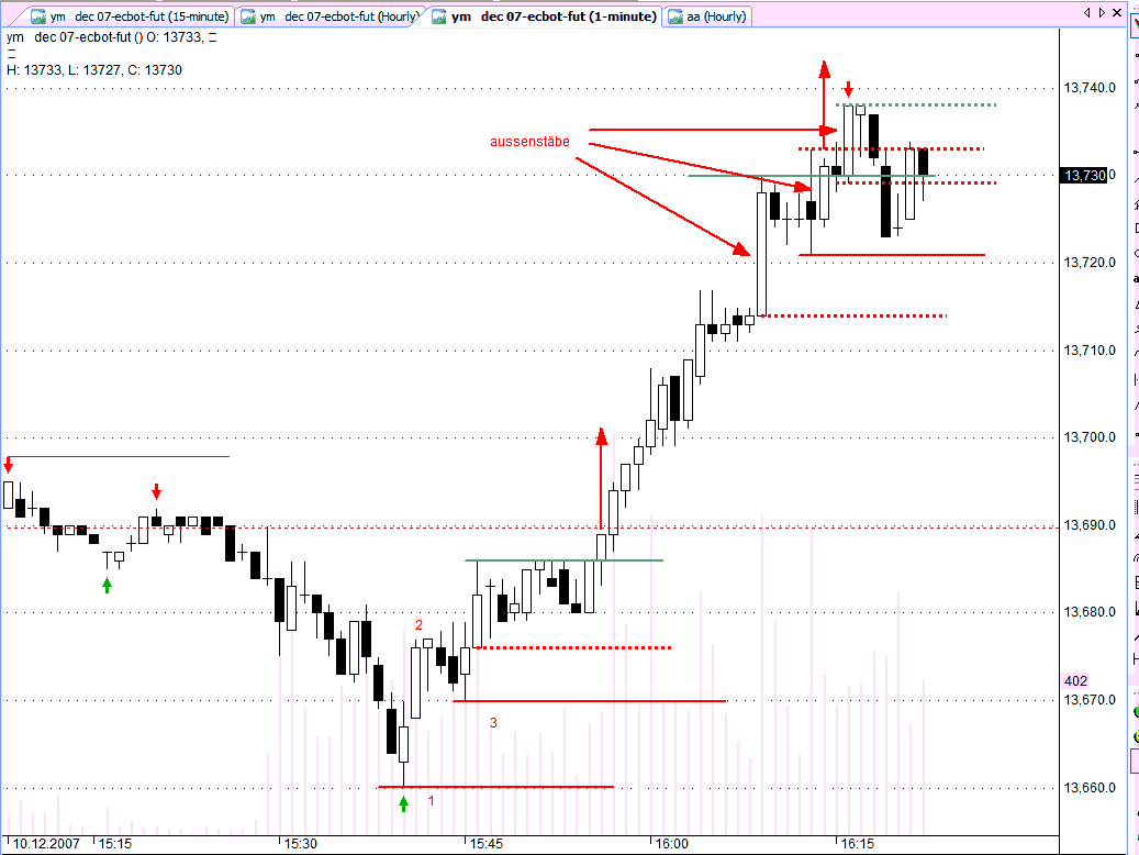 Grundsätzlich muss ich DickT zustimmen. Eine doppelte Rückversetzung nach der Voigt´schen Innenstabregel gibt es nicht. Man wäre in dem Fall beim Unterschreiten des Tiefs der Vorkerze ausgestoppt. Allerdings macht die Innenstabregel erst ab Zeiteinheiten von 10 Minuten und größer Sinn, da das Erscheinungsbild der Perioden in kleineren Zeiteinheiten rein willkürlich entstehen kann. (Voigt S. 2555 + Fußnote 64)
