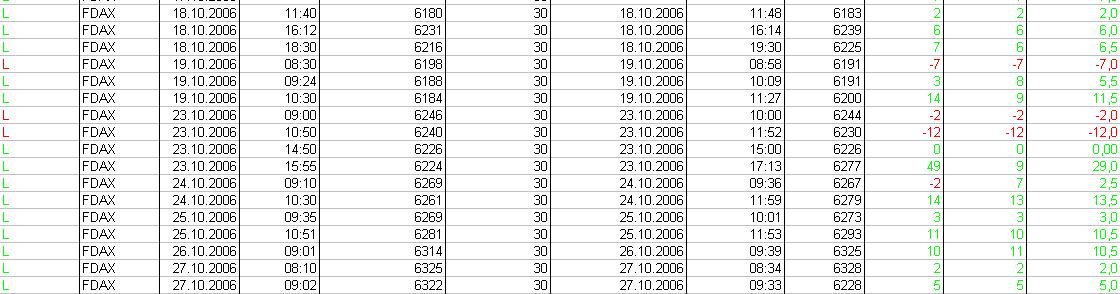 (Erläuterung zur Tabelle: 1. Spalte(Long oder Short L/S) 2. Spalte Unterlying 3. Spalte Datum 4. Spalte EntryZeit 5. Spalte Entry Preis 6. Spalte Stückzahlberechnung aufgrund des angegebenen Maximalrisikos 7. Spalte Exit Datum 8. Spalte Exit Zeit 9. Spalt Exit Preis 10. Spalte Ergbnis Haupteil 11. Spalte Ergebnis Money Management Position 12. Spalte Gesamtergebnis des Trades)