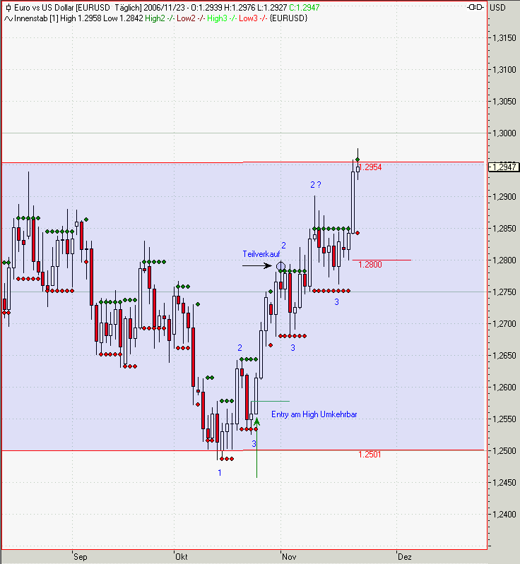 Der TS kann auf 1,2842 (Low der Ausbruchsbar) gesetzt werden! Damit ist der 2. Teil der Position über mehr als 300 Pips im Plus.