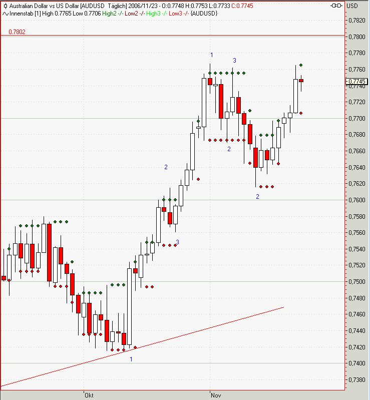 Da es einige Frage zum System gab! Ich versuche nach dem Voigt Markttechnikbuch FX-EOD zu dokumentieren! Für Leute die das Buch nicht gelesen haben, ist es sicherlich schwierig nachzuvollziehen! Ich will aber nicht das Buch abschreiben! Nur soviel! Nach Markttechnik von Voigt gibt es bestimmte Einstiegspunkte und zwar sind das die Punkte 2 im Chart! An diesen Punkten ist mit Bewegung zu rechnen, da dort unter anderem auch Stops von positionierten Traden liegen! Im Buch werden 3 Arten des Tradings beschrieben! Das Trendtrading, Bewegungstrading und Ausbruchstrading! Ich trade immer nur die Bewegung! Für jeden dieser 3 Arten gibt es bestimmte Stopsysteme! Beim Trendtrading ist es immer der Punkt 3! Bei der Bewegung wird der TS mit Berücksichtigung der Aussenbar-Innenbar genutzt! Beim Ausbruch wird nur ein schnelles kleines Gewinnziel angewendet! Eine Innenbar liegt dann vor, wenn open und close kleiner dem High(Low) und Low(High) einer vorhergehenden Bar ist! Dann setzt man den Stop zurück auf die Bar vor der Aussenbar! Ansonsten liegt der TS bei Long immer auf dem Low(High) der letzten Bar! Wenn man es einmal verstanden hat, ist es vollkommen einfach! Es gibt keine Indikatoren oder sonstiges!