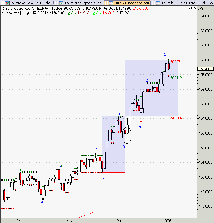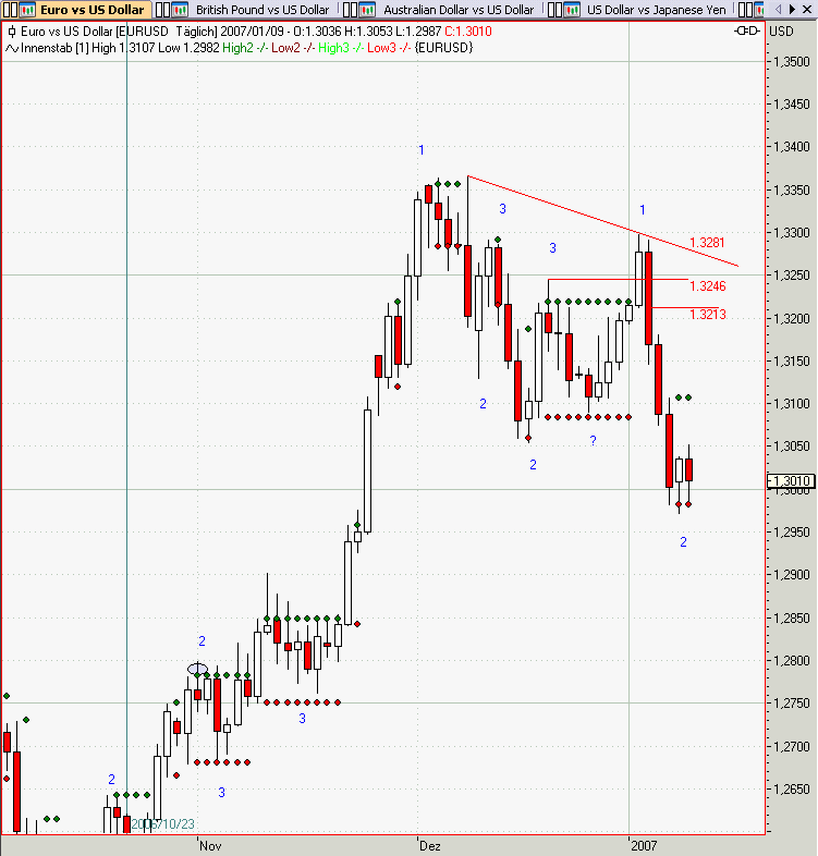 War die Tagescandle vom Euro gestern auch ein noch ein Innenstab. Denn streng genommen war der Schlusskurs oberhalb des Außenstabes vom 11.1.07.