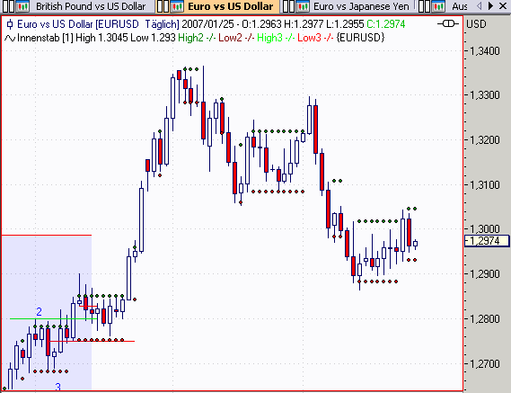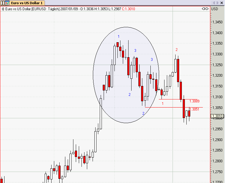 Wenn ich Deinen Chart sehe, leuchtet mir das ein! Dann hätten wir ein klares ShortEntry @1,3055 am Punkt 2! Dann wäre auch die Unkehrbar als Innenbar (Seite 362 im Voigt) nicht als Gegensignal zu beachten! Alles klar und kein Problem mehr da!