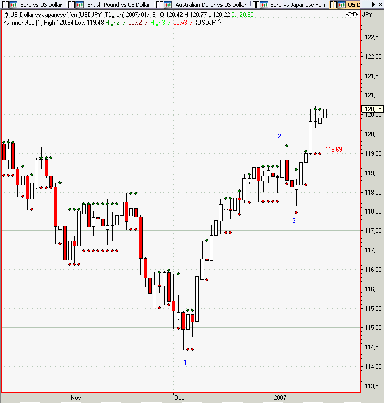 USDJPY Long am 10.01.2007 mit 0,4 Lot @119,69 IS=118,68 TS=119,11 wegen Innenbars