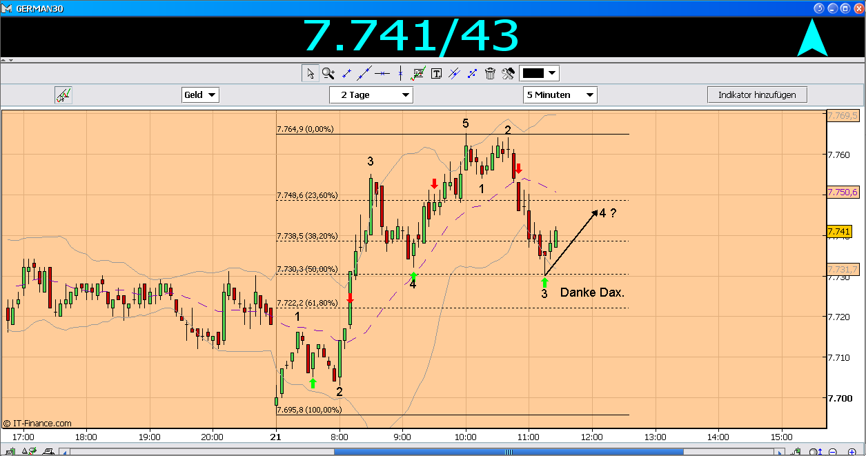 Steigst dann am Ende der 4 Welle ein mit einem SL unter dem 50% Retracement. Berechnest den Endpunkt der Welle 5 fast punktgenau und gehst an dieser Stelle mit einem SL vom 6 Punkten Short und nimmst einen Großteil der Korrektur mit.