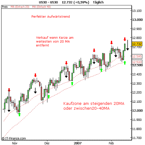 Wir betrachten das Basisinstrument mit 2 Simple Moving Averages und zwar 20 und 40 (Tageschart.) In einem Aufwärtstrend sehen beide aus wie Eisenbahnschienen, je weiter um so besser. Wir erkennen die Korrektur, wenn sich Kurse weit von dem 20 MA wegbewegen und die Kaufzone am 20MA oder zwischen dem 20 und 40 MA. Invers bei einem Abwärtstrend.
