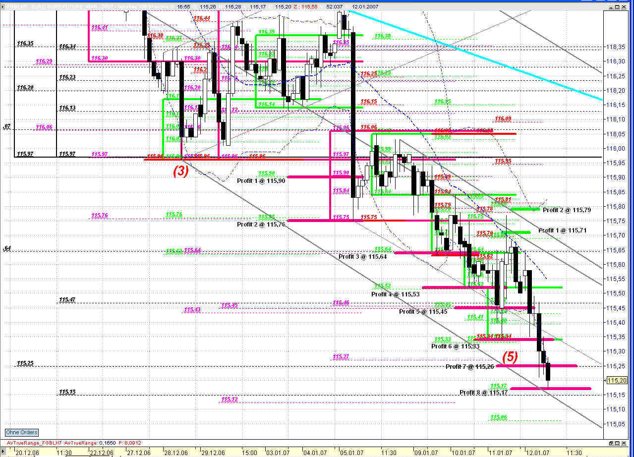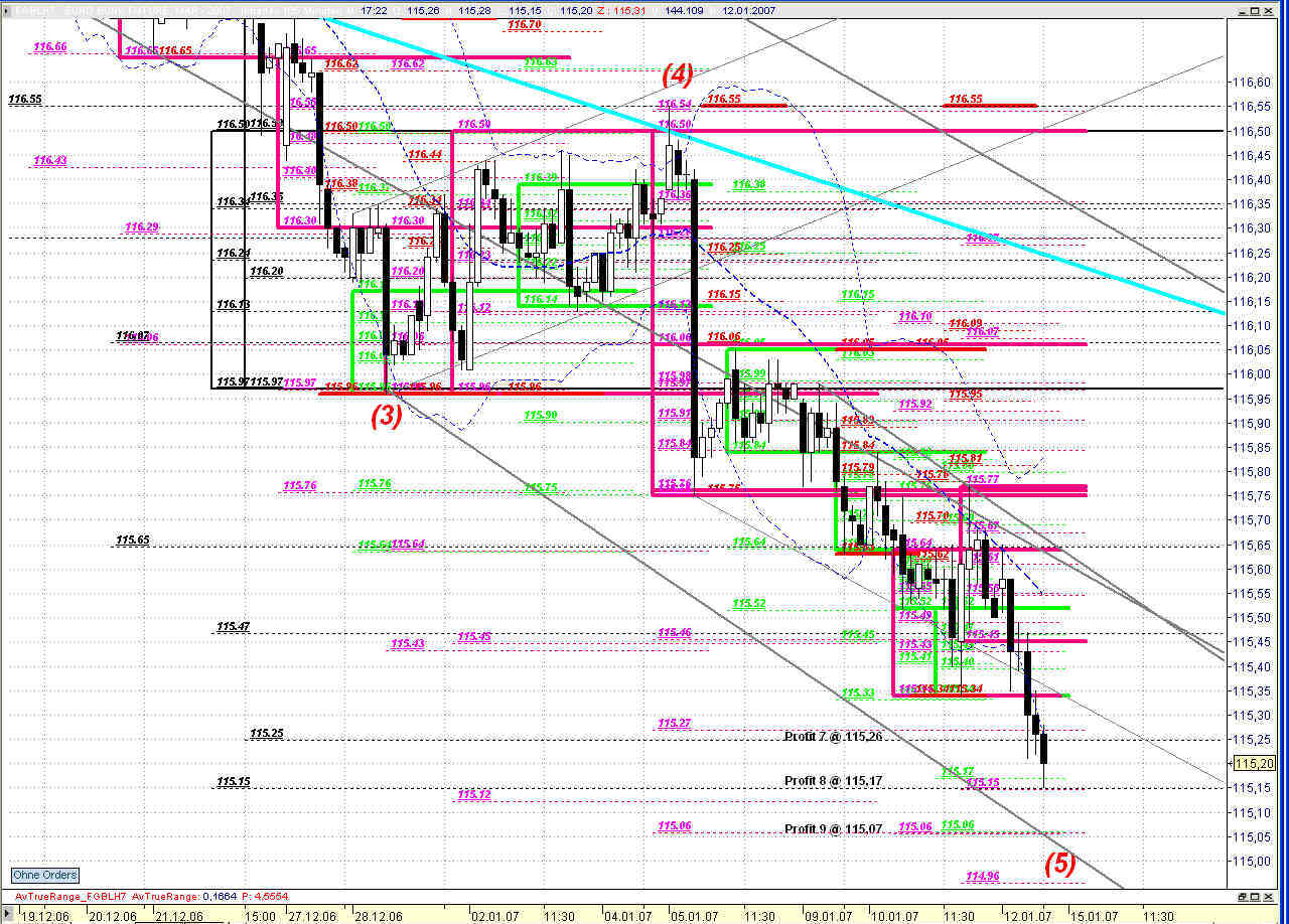 Womit nun Imuls 3 und 5 die gleichen Längenverhältnisse aufweisen. Sollte der FGBL nun nicht mehr über sein heutiges Tageshoch bei 115,34 ansteigen können und in der Folge unter die 115,26 fallen, befindet er sich aktuell schon in seinem neuen Abwärtsimpuls 1 und es bleibt bei dieser Zählweise. Ziele liegen - bis auf weiteres - bei 115,15 (Minimal) / 115,07 (Normal) / 114,97 (Maximal).