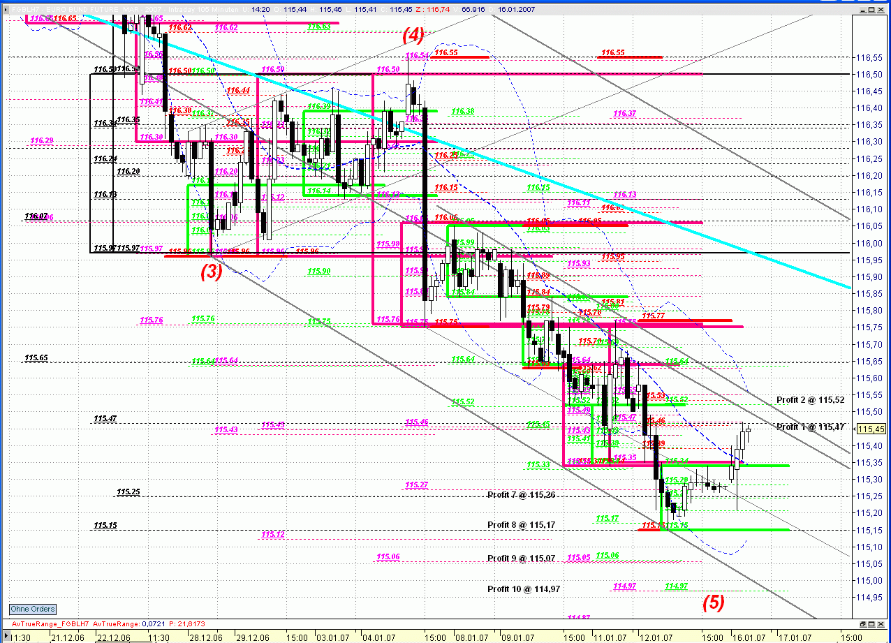 Der kleine Impuls 5 stellte sich als "verkürzte" Variante dar, nachdem das heutige Tageshoch das potenzielle Maxiziel bei 115,75 um drei Ticks verfehlt hatte. Manchmal funktioniert es halt nicht auf den Tick genau.