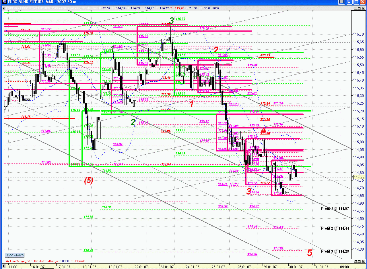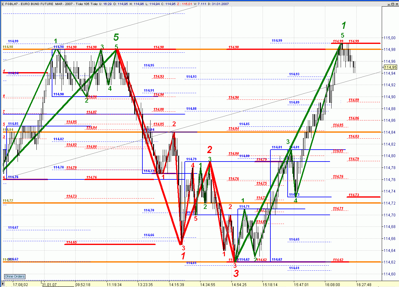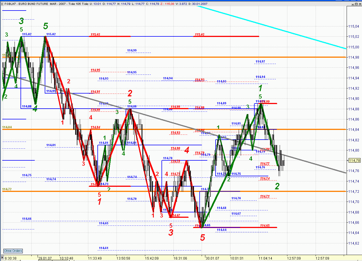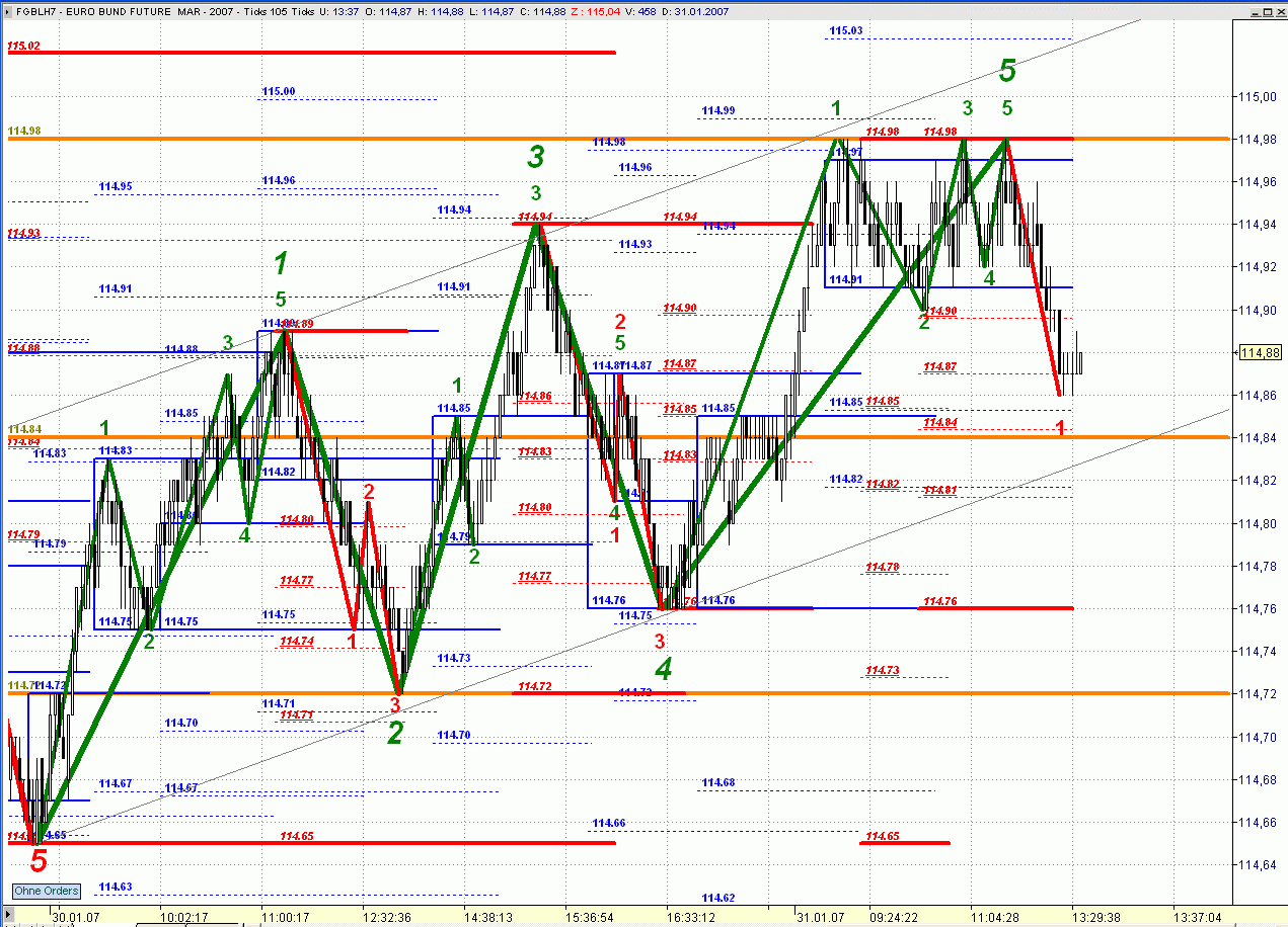 Wie befürchtet ist der FGBL immer für einen Fake gut. Ferner hat sich gezeigt, dass die bisherige große Korrekturwell 2 nicht als solche gezählt werden durfte, da sie halt nicht den Mindestanforderungen von 11 Ticks entsprach. Daher musste die Zählweise umgestellt werden und es ergaben sich neue Kursziele bei 114,99 und 114,94.