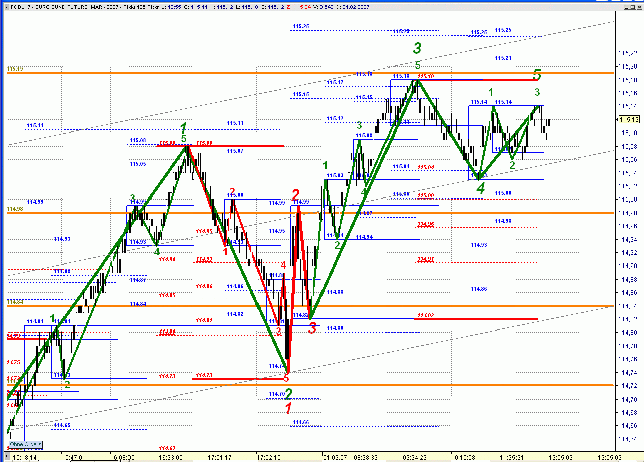 Wie befürchtet ist der FGBL immer für einen Fake gut. Ferner hat sich gezeigt, dass die bisherige große Korrekturwell 2 nicht als solche gezählt werden durfte, da sie halt nicht den Mindestanforderungen von 11 Ticks entsprach. Daher musste die Zählweise umgestellt werden und es ergaben sich neue Kursziele bei 114,99 und 114,94.