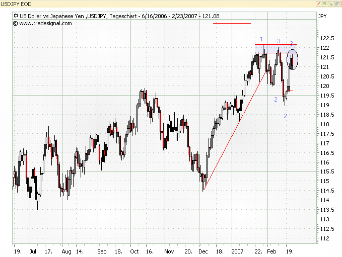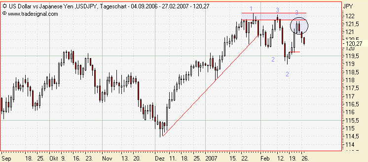 bei 122,00 sind wir auf einen Widerstand gestoßen! Es hat sich ein neuer Punkt 3 gebildet! Es hat sich ein Harami Pattern (Innenbar) gebildet. Bestätigung muss abgewartet werden. Spekulation auf Shortentry!