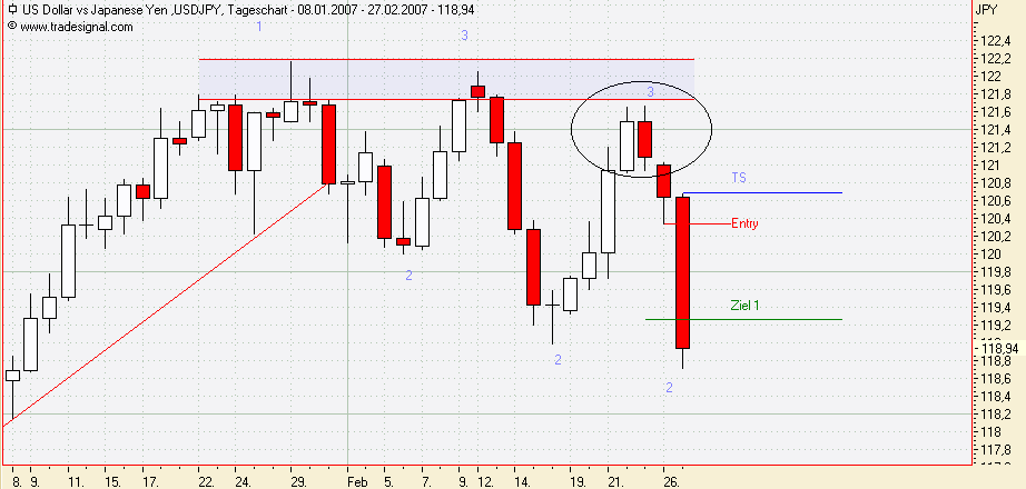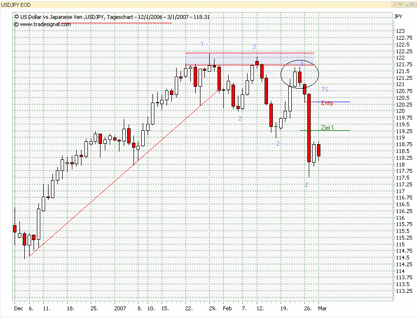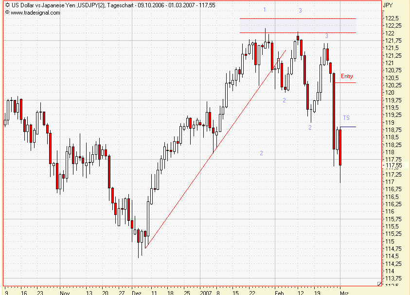 1. Trade: Nach gestriger Innenbar ging es heute weiter gen Süden! Die 2. Positionshälfte wir jetzt am neuen TS = 118,85 abgesichert. Als Nächstes warte ich auf eine Korrektur, um dann am neuen Punkt 2 oder mittels Candle eine neue Position aufzubauen. Bis dahin gilt der TS!