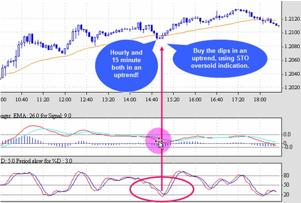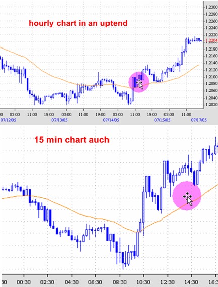 It seems natural to think that any two trends covering the same time span will give the result, but that is not the case. Although, we can average many data points, we cannot get rid of all the noise; fewer data points over the same time span will always yield a smoother result. Therefore, the use of hourly, daily, and weekly time periods multiple time frames gives a much different picture of the market than simply using three different moving averages based on the same data.