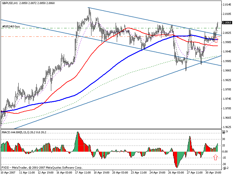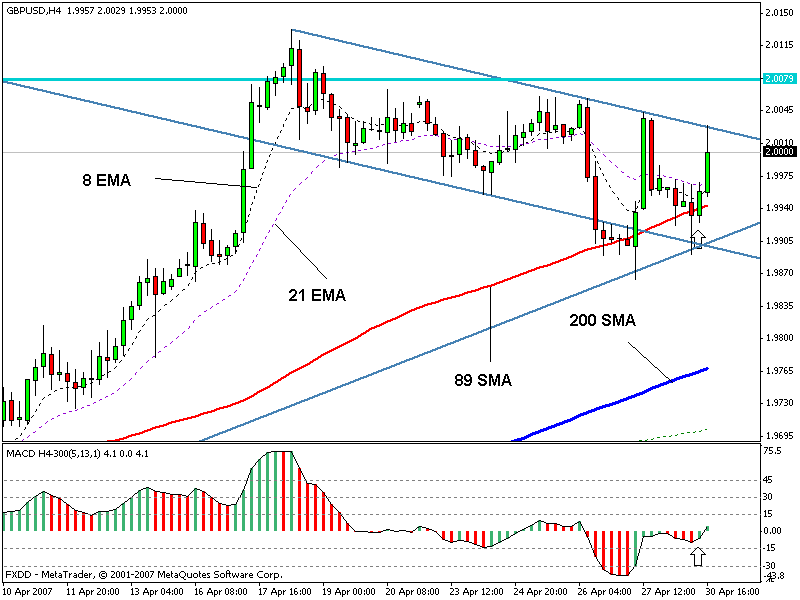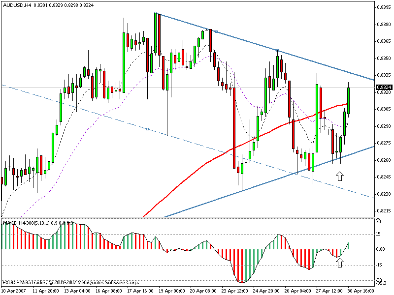 Hier kam es mit Close der 8.00 Uhr-Candle zu einem Higher-Low-TrendContinous (TC) Signal auf dem MACD. Leider hatte ich die untere Trenlinie noch nicht eigezeichnet. Ohne diese sah das Signal nicht besonders vielversprechend aus. Stattdessen sah ich einen Abwärtskanal (gestrichelte Linie). Soweit ich mich erinnere, sollen Countertrades und Trades in Seitwärtsphasen nur in Verbindung mit Widerständen und Unterstützungen eingenommen werden (an MA's, TL, Channels...). Bei Trendtrades sollte man Retracements zum 21er EMA traden.