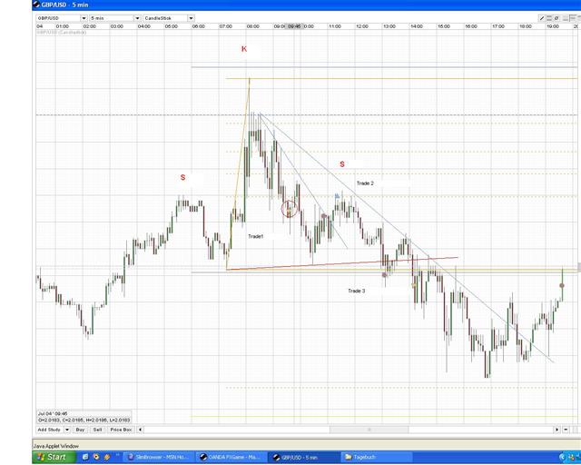 So das war der Anfang vom Ende zumindest schien es so. Nachdem der Cabel vom SP20 bis zum SP80 durchmaschierte, bin ich von einem weiteren Downmove ausgegangen. Ich hab also auch en Rücksetzer an den SP00 gewartet und bin dann short mit Ziel unterhalb der 80. Von Anfang an war mir aber nicht ganz wohl bei der Geschichte da der IS aus chartechnischer Sicht oberhalb des letzten Hochs, bei @25 satte 28 von meinem Einstieg entfernt war. Das war viel zu viel!!!!! Es kam wie es kommen musst meine Gier wurde bestraft, der Cabel drehte mit dem Euro gleichzeitig bewegte sich der EUR/GBP nach Süden. Minus 28 PIPS