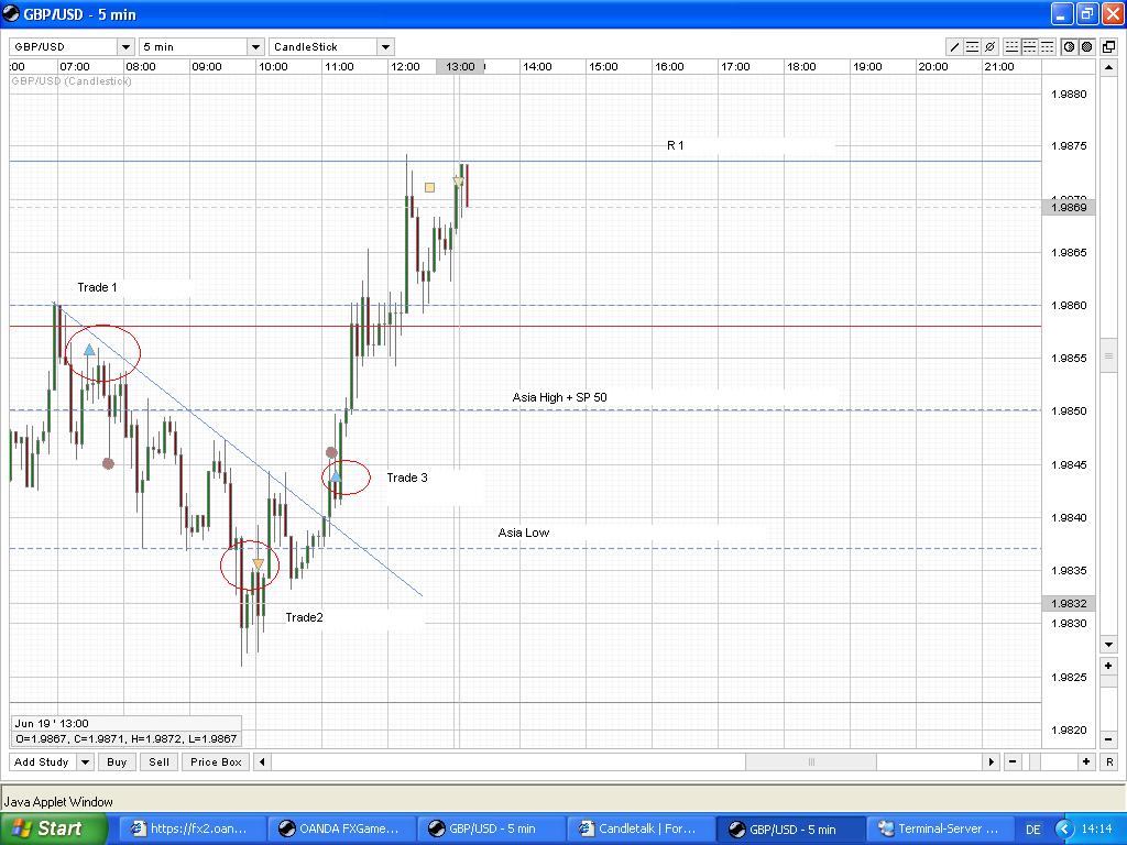So was soll ich dazu sagen. Ich habe gegen eine meiner Grundregeln verstossen und bin ein Trade mit doppelter Lotgrösse eingegangen nachdem ich zwei Verluste hatte. Zu meiner Verteidigung kann ich nur sagen ich musste es machen!! Bruch des Abwärtstrendes und ein 123 setup, 60min TF sah auch gut aus gepaart mit einem sehr guten Gefühl beim Einstieg. Der Trade läuft noch hab bei R1 die Hälfte der Pos. geschlossen und SL auf 1.9858 nachgezogen bis jetzt + 28 Pips