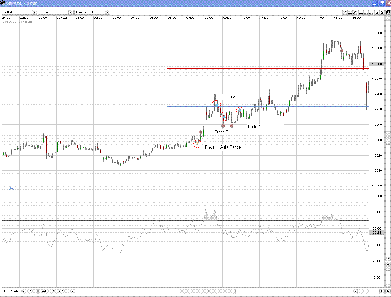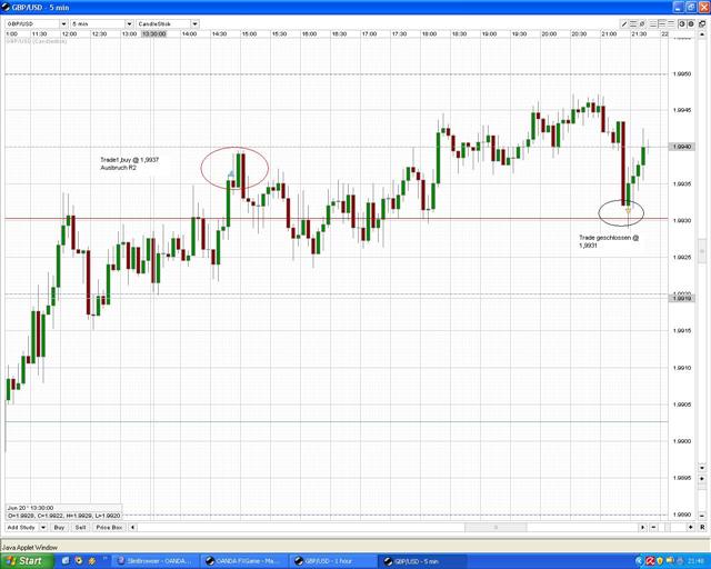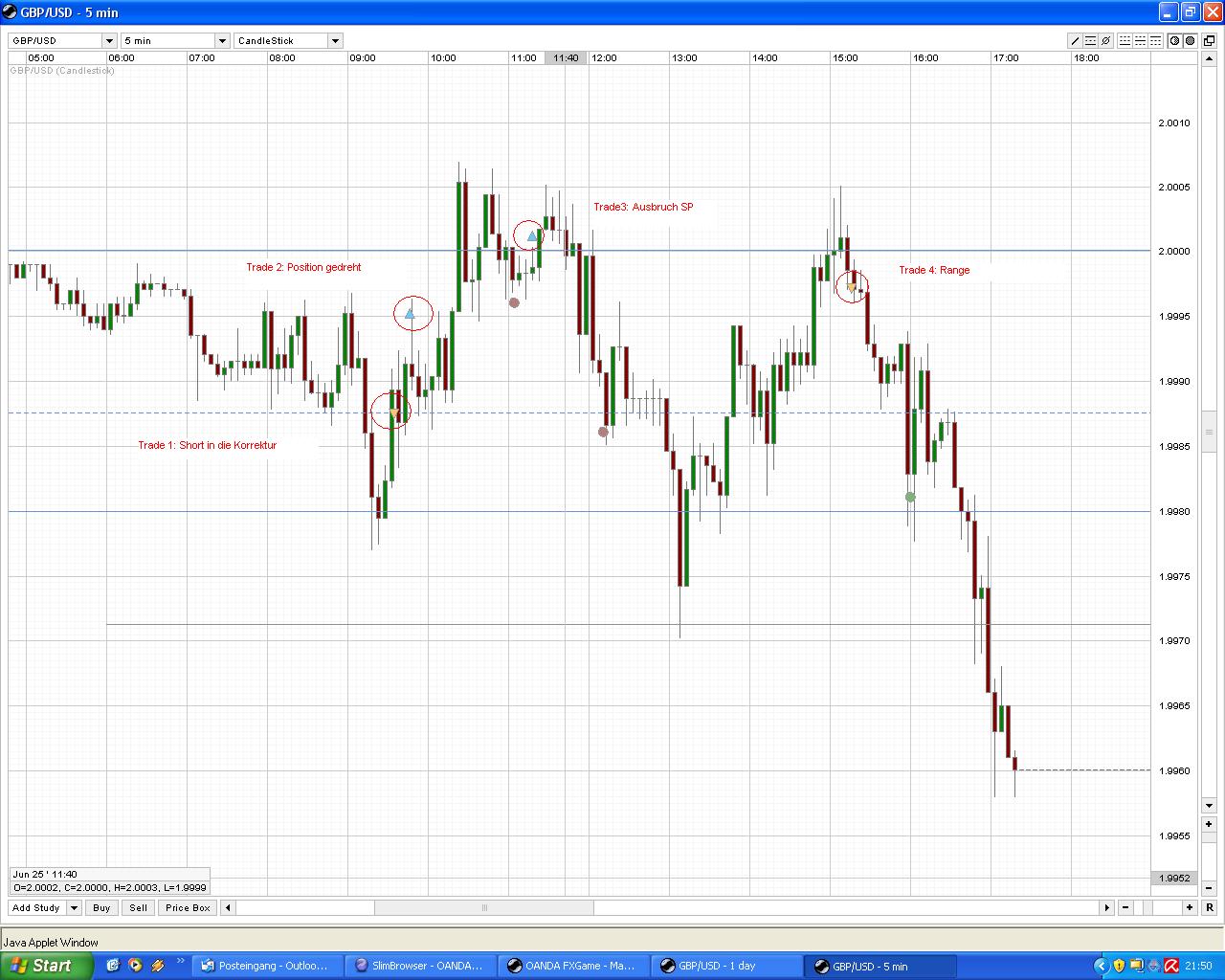 Wie so oft haut mich der letzte Trade meist aus der ....eisse. Trend war für mich immer noch bullish. Wollte dabei nicht warten bis R1 durchbrochen wird, da oft der Kurs danach davon rauscht. Also Einstieg bei 1,9951. Da der Kurs die 80 und R2 scharf durchschossen hatte, habe ich TP kurz unter SP00 angenommen. Als der Kurs dann in die Nähe gekommen war hab ich TP nach oben verschoben, da ich von einem weiterem Kursanstieg (GIER!!) ausgegangen bin. Hab dann den SL eng getrailt und bin bei 1,9988 raus.