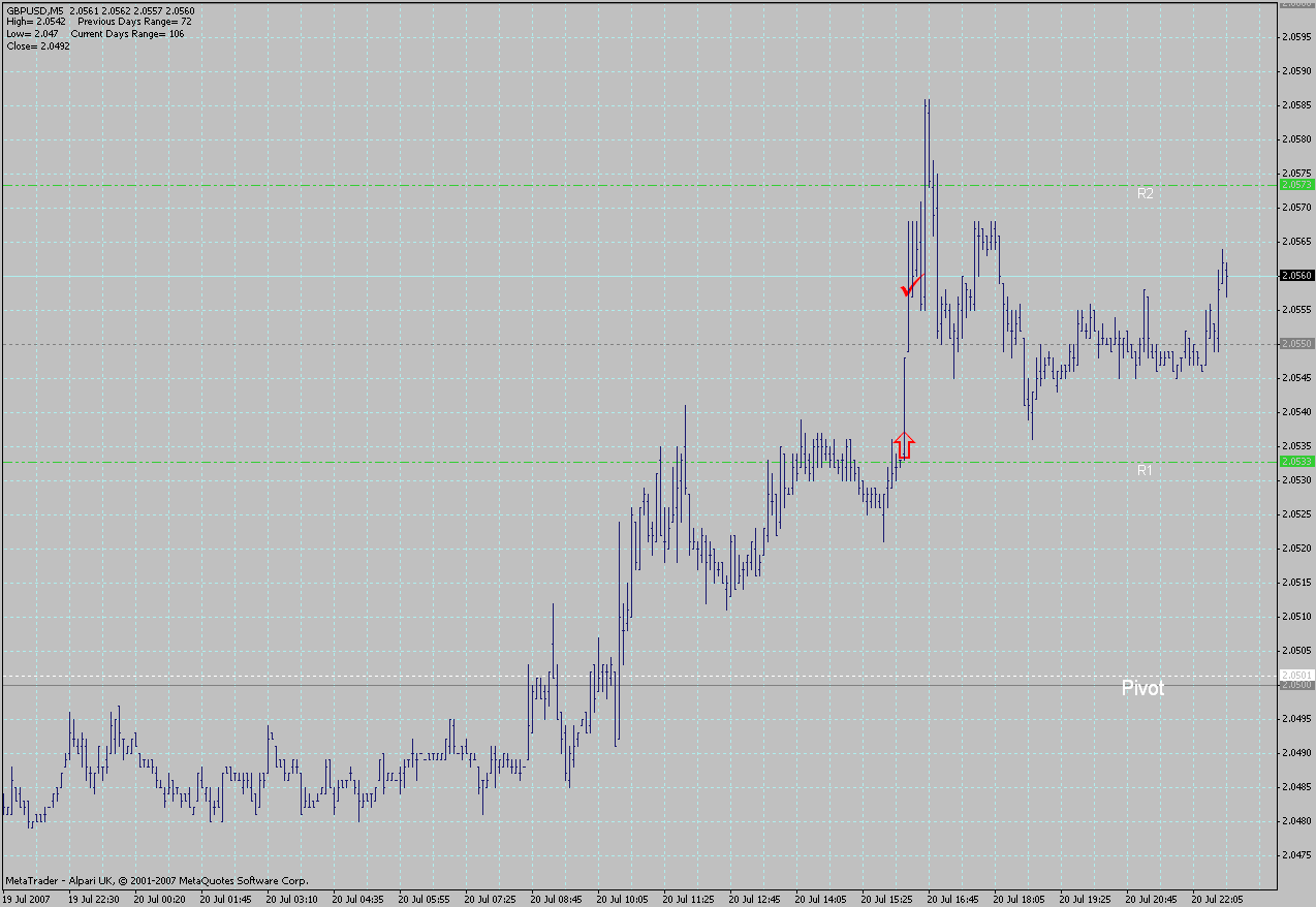 Der Trade lief gut an und ich war schnell 15Pip im Gewinn. Als der EURO allerdings den für mich unerwartetetn Downtrend verlies, indem er um 14:05 den Pivot durchbrach, schloss ich die Position mit einem Gewinn von +10Pip