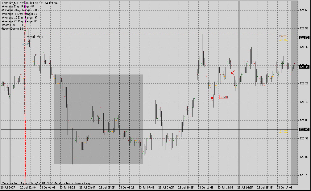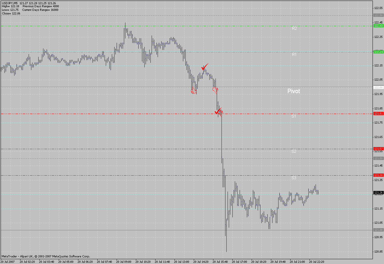 2 Möglichkeit: Das war eine sehr gute Chance um short zu gehen. Der Yen fiel unter sein bisheriges Tagestief, sodass hierbei Dynamik zu erwarten war. Das Ziel hierfür wäre der S1 gewesen. Der EURJPY und Euro wären für diesen Trade ebenso positiv gestimmt gewesen. Zum einen hatte ich den Trade nicht getan, da ich zu dieser Zeit nicht vor dem Bildschirm war. Aber ich hätte ihn auch so nicht gemacht, da zu dieser Zeit bei mir ein mächtiges Unwetter war und ich jederzeit damit rechnen musste, dass es die Sicherung raushaut. Da habe ich keine Lust in einem Trade festzustecken.