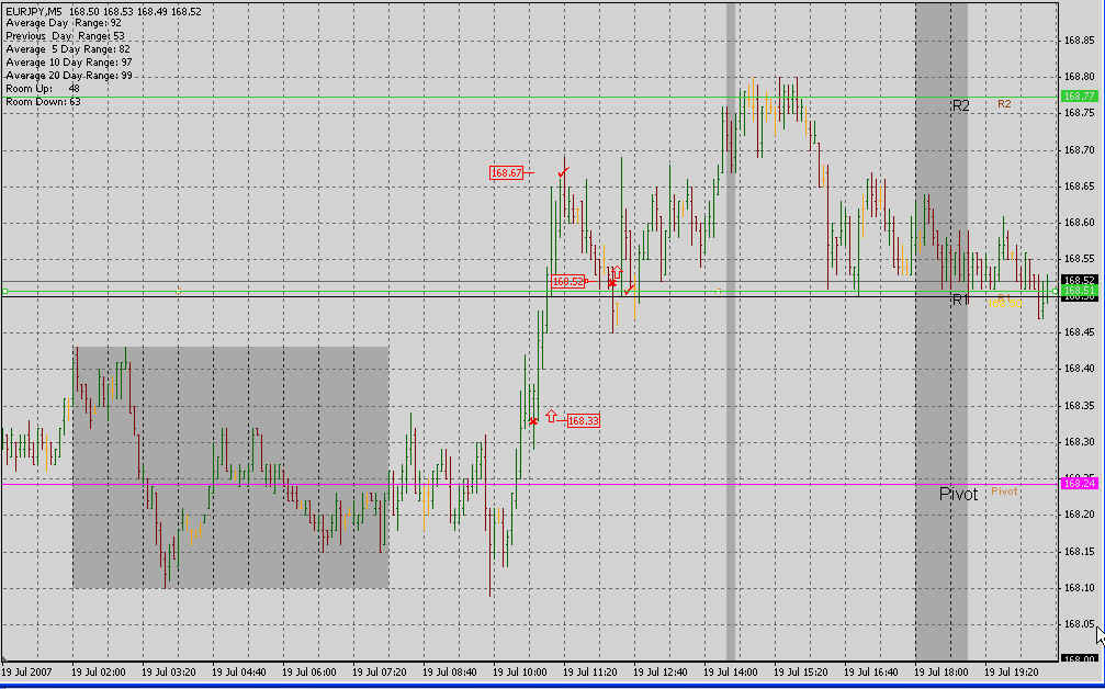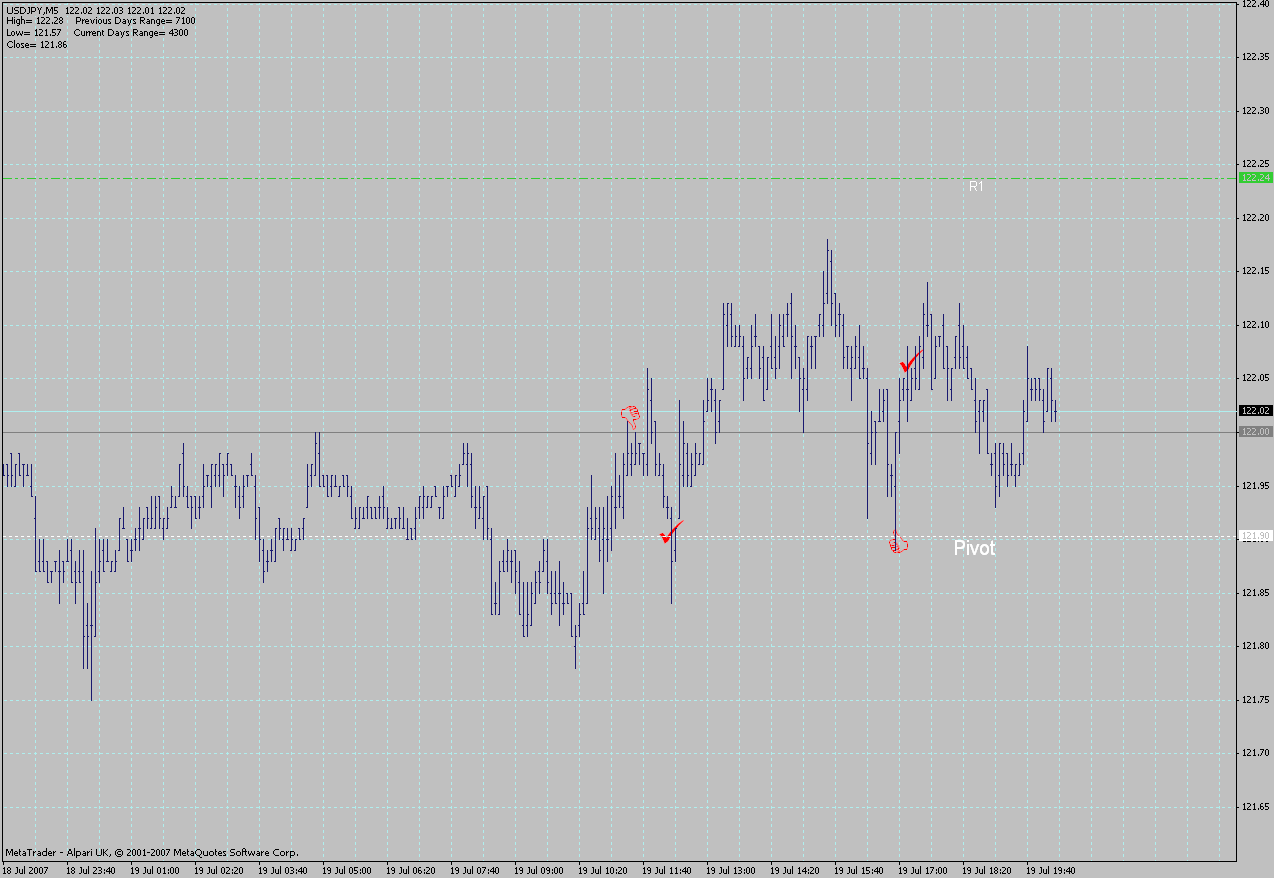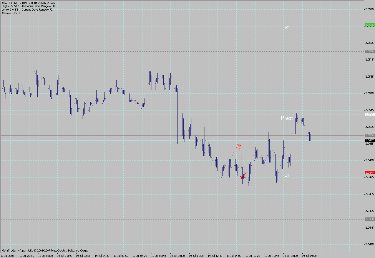 Der Yen befand sich zu der Zeit am Pivot, der Euro konsolidierte bullisch am Tageshoch und man merkte, dass er weiter up wollte. Somit auch von der Seite keine Einwände gegen den Trade. SL einige Pips unter Pivot , d.h @20. Trade ging voll auf. ich hätte ihn bei 67 geschlossen, da zu der Zeit der yen an einem dicken Widerstand dem SP ankam. Somit wären 34Pips hängen geblieben.