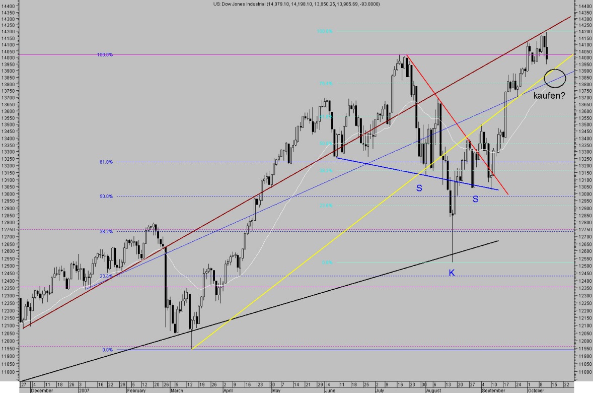 Was mich ja noch beunruhigt ist, dass zwischen 14100 und 14250 ein ganzes Band von Fibo-Extentions anderer Bewegungen kumulieren (nicht auf dem Bild drauf). Die Abwärtsbewegung hat sich jedenfalls heute schön im 10min Chart angekündigt, das war gut handelbar.