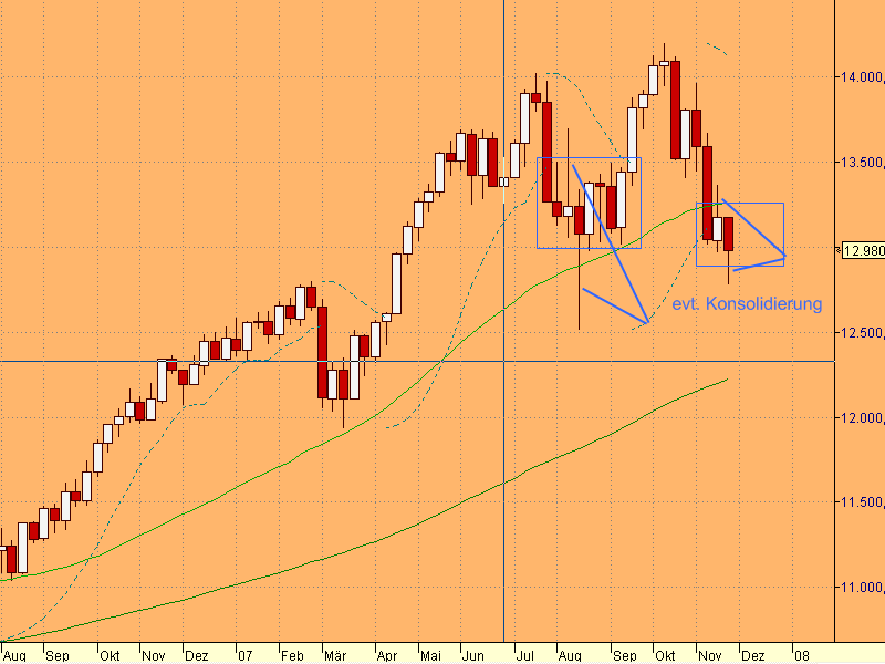 Vielleicht hab ich mich nicht ganz klar ausgedrückt. Aber mit "vorweggenommen" meinte ich die relative Stärke oder hier Schwäche zu korrelierenden Indizes. In allen wichtigen Indizes hat das letzte Tief vom 12.11. (beim Fdax bei 7743) gehalten. Der Dax ist in der Spitze von da um rund 140 Punkte durchgereicht worden. Da hat man eine Fortsetzung des Abwärtstrends vorweggnommen, was, wenn es so nicht eintrifft, ev. genauso intensiv korrigiert werden kann.