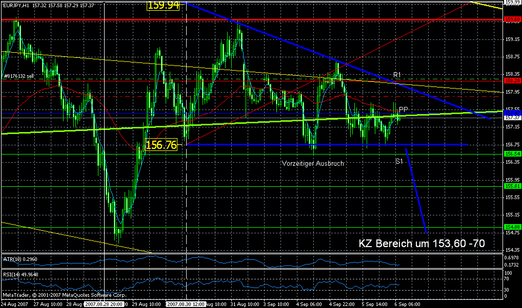 Ein vorzeitiger Ausbruch am 4.9.07, Kurs unterhalb PP und langfristiger Aufwärtstrendlinie lässt das Shortszenario als wahrscheinlicher erscheinen. -