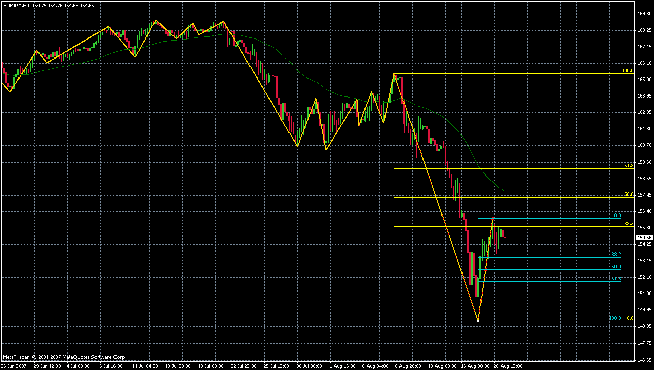 Im 4h Chart sind alle 3 Werte fast identisch in die Korrektur gegangen und so zwischen 38,2 und 50 Fibo Retracement zum stehen gekommen.