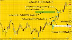 Zelle AF11- 55,6 Ticks sind 42,4 Ticks weniger als man mit individualen TP und Standard SL erreicht hätte, also wenn man nicht schon vorzeitig per Marketorder ausgestiegen wäre.