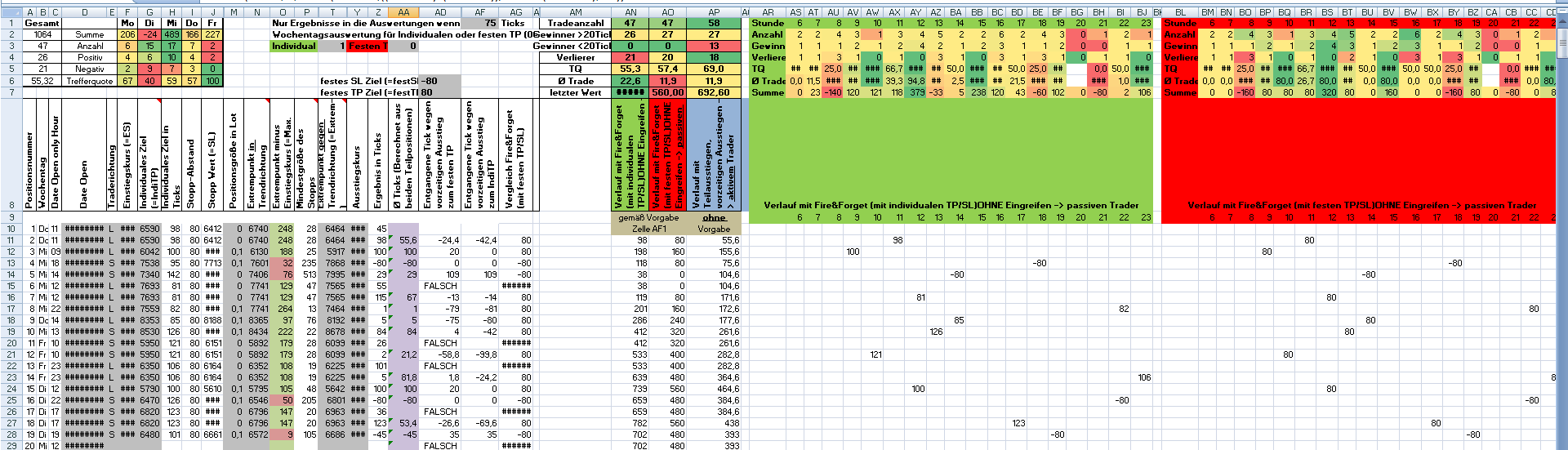 In den Spalten AM bis AP werden die Daten erfasst und nach den Grundwerten (Tradeanzahl, Anzahl Gewinner größer 20 Ticks, Anzahl Gewinner kleiner 20Ticks, Anzahl Verlierer, Trefferquote, Durchschnittstradeergebnis und den aktuellen Stand) in den Farben grün-gelb-rot automatisch verglichen.