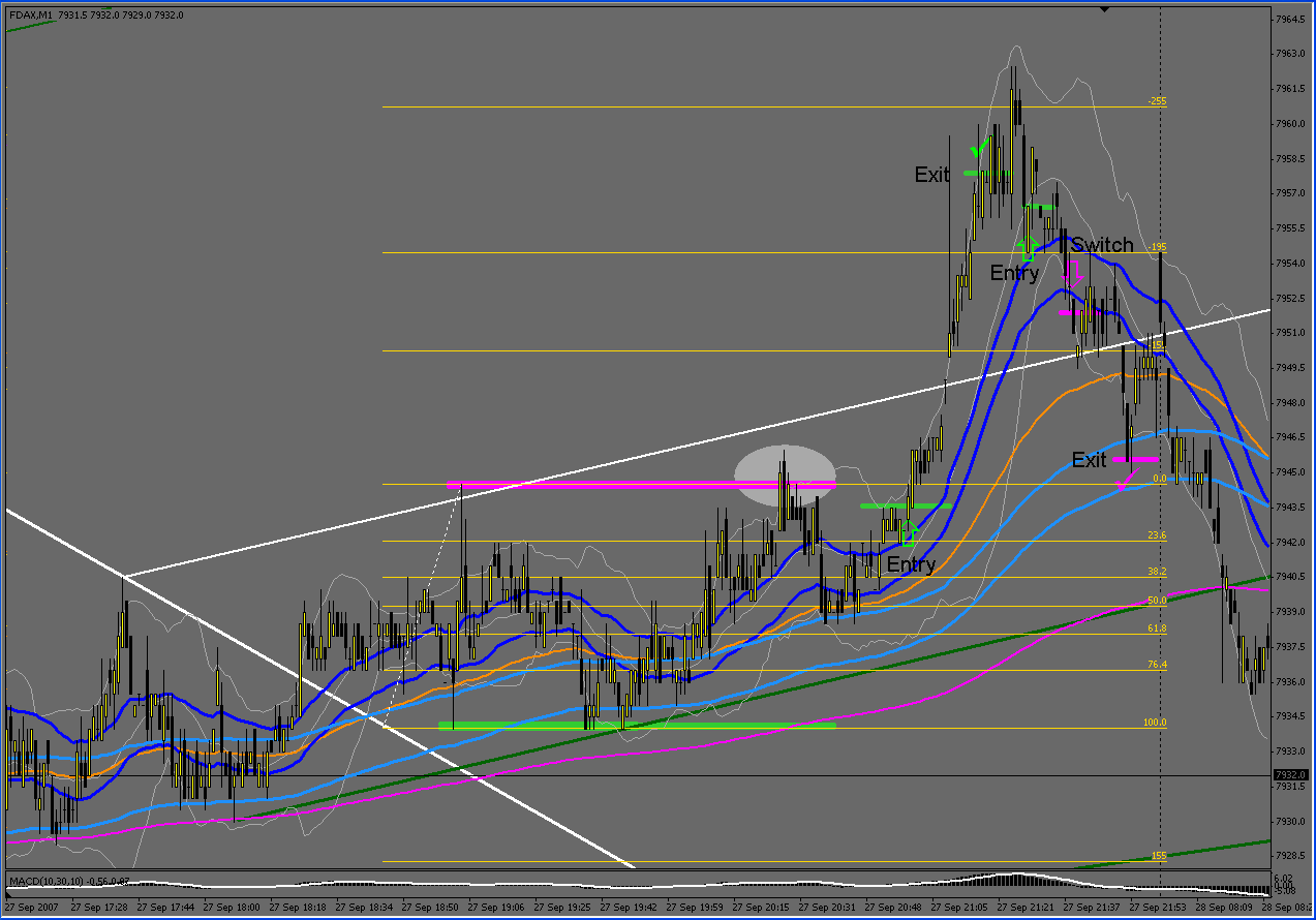 Ich hoffe es kam klar verständlich rüber?! Zur visuellen Bestätigung meiner Erläuterungen stelle ich noch einen Screenshot des 1min-FDAX-Charts ein. Die markierten Entrys und Exits können dabei vernachlässigt werden, da es sich dabei lediglich um die letzten drei FDAX-Trades im Sino-Börsenspiel vom 27.09.07 handelte. Wollte nicht extra noch einen neuen Chart "basteln". ;)