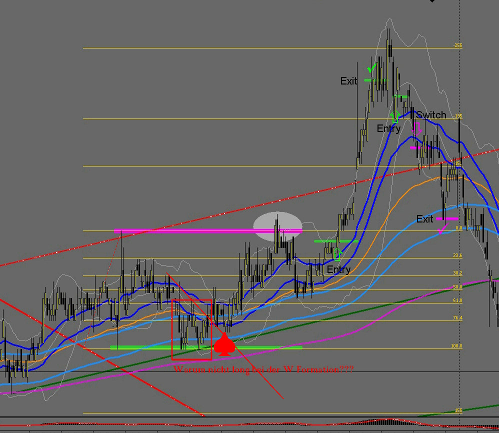 PS.: Vielleicht sei noch dazugesagt, dass dieses Beispiel hier ohnehin nie in einem Long-Trade enden dürfte, weil ja wie man am Bild erkennt der Ausbruch schon von einem Shortfilter (magenta) eingeschlossen wird. Ich habe das Bild nur deswegen herangezogen weil ich es schon gehabt habe und hier ein Ausbruch über den Punkt 2 erfolgt der sich gleich in eine Umkehr niederschlägt. Würde der Ausbruch in einem Grünen bzw. weißen Bereich sein wäre dieser Trade grundsätzlich reif für einen Long-Einstieg. (aber das ist eine andere Geschichte, die Filter dienen mir hauptsächlich der Orientierung).