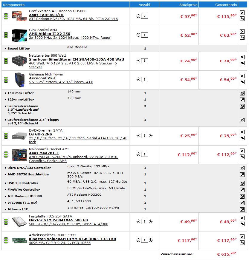 Beim Arbeitsspeicher, CPU und Board bin ich mir am unsichersten. Der Arbeitsspeicher müsste noch gegen einen 1333 getauscht werden aber das soll auch nur ein Beispiel sein.