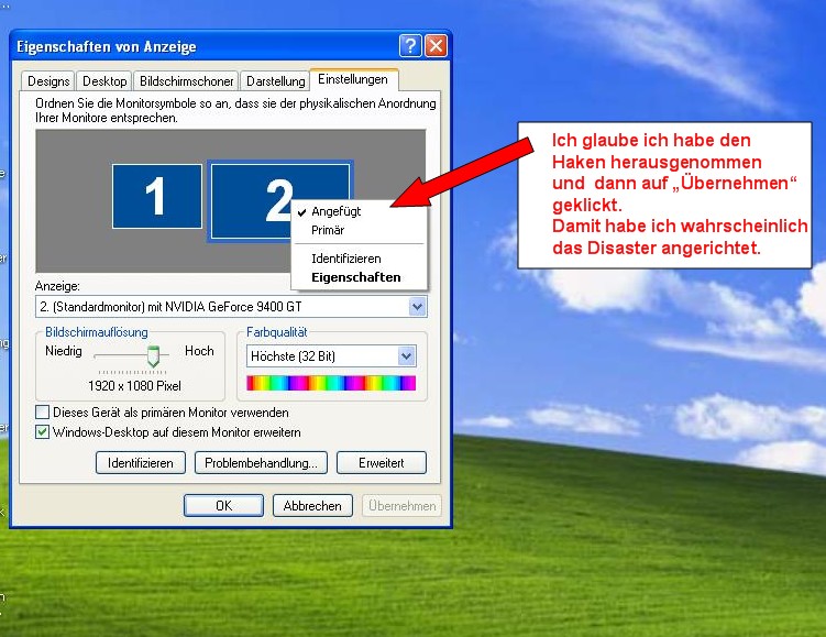In meinen Computer sind 2 Nividia Geforce 9400 GT und ein Techniker hat ihn mir nach langem Hängen und Würgen dann endlich so eingestellt , dass die beiden Karten zusammenarbeiten und 4 Monitore angezeigt werden können. Ich benutze Win XP.