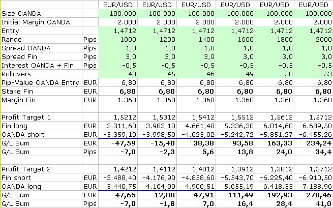 Die Gefahr ist, daß die Kosten schnell höher sind als die Gewinne. Denn die Range muß ziemlich groß gewählt werden. Nur dann ist die Differenz zwischen Stake und den Pip-Values an beiden Profit Targets groß genug, um zunächst mal die Spreads zu decken. Slippage müßte auch noch einkalkuliert werden. Und je weiter die beiden Profit Targets vom Entry entfernt sind, desto mehr Rollovers wird es geben. In Trendphasen mag das noch im Rahmen bleiben, aber in Seitwärtsphasen wird das einiges an Zinsen kosten.