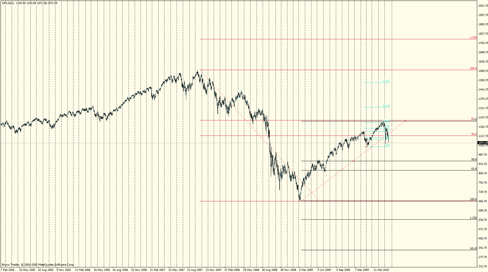 Der S&P 500 befand sich 2009 in einer Korrekturphase. Diese fand ein jähes Ende kurz vor dem 61er Fib retracement. Zufällig (eher nicht) hielt der Zug auch an der 161er Extension des letzten Upmoves. Für einem Fortbestand des Uptrends im technischen Sinne hätte einen Bounce am 50er oder 61er Fib des letzten Upmoves gebraucht. Der "fat finger thursday" hat dafür gesorgt,dass diese Levels überrannt wurden. Nun kann man dieses Tag nicht ganz ernst nehmen. Jetzt befinden wir uns allerdings wieder bei den Lows dieses Tages und nun wird die Sache ernst. Technisch gesehen hat der S&P 500 seinen Abwärtstrend der Jahre 2007 und 2008 wieder aufgenommen. Das Ziel ist 540 Punkte, oder ca. 50% Wertverlust. Ich sage nicht, dass ich glaube. das wir diese Levels sehen werden, das ist einfach das technische Bild, das sich im Moment ergibt.
