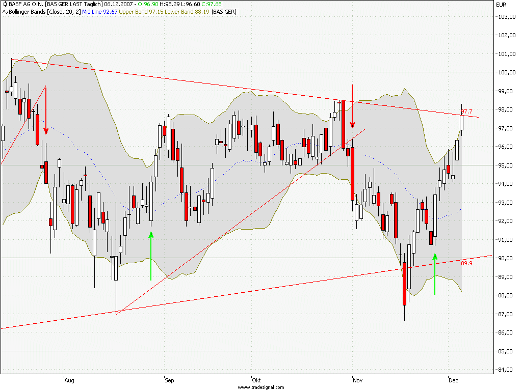 Die zähe Seitwärtsphase seit Juli hat zwar noch kein Ende genommen, aber BASF nimmt seit dem 28.11. gehörig Anlauf auf die obere Begrenzung. Heute wird schon der Abwärtstrend attackiert, danach steht nur noch die magische 100er Marke im Weg. Ich bin noch nicht investiert, warte erst einen klaren Trend und dann ein Fortsetzungssignal ab.