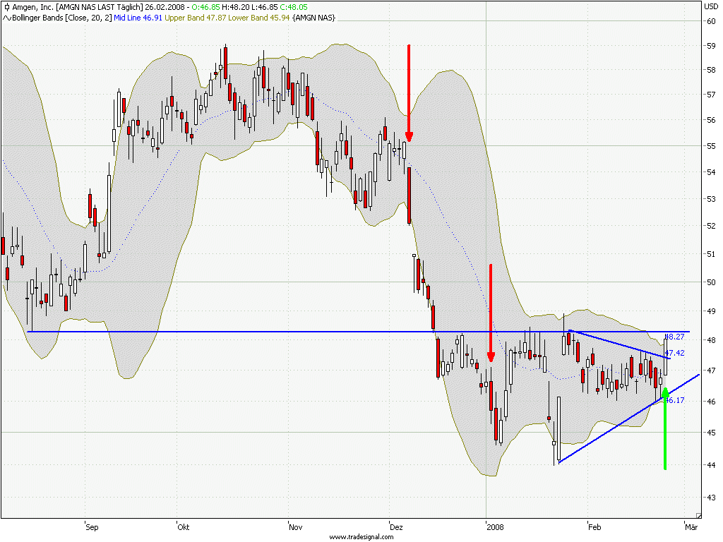 Amgen war immer ein heißes Pflaster für mich, zu unrythmisch meist die Kurse, wie auch seit Jahreswechsel ersichtlich. Langsam könnte sich aber wieder ein Trend heraus kristallisieren. Heute wird wohl der erste Startschuss zu hören sein, Ausbruch aus dem kleinen Dreieck der letzten Wochen nach oben. Ein großer dicker Querwiderstand um 48,3$ ist aber noch zu überwinden, bevor ich meine Hemmungen fallen lassen werde. Danach sollten rasch 51$ aufscheinen, ein neuer Shorttrade kommt in dieser bisherigen unruhigen breiten Range ohnehin nicht in Frage.